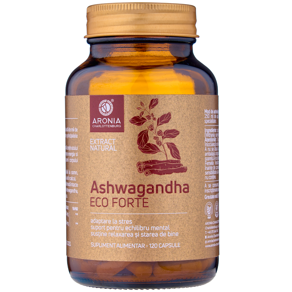 Ashwagandha ECO Forte 120 Capsule este un supliment alimentar premium, realizat din extract ecologic standardizat de ashwagandha (Withania somnifera), o plantă adaptogenă cunoscută de mii de ani în medicina ayurvedică. Formula concentrată ajută organismul să se adapteze la stresul zilnic, susține nivelul de energie, contribuie la echilibrul hormonal și sprijină starea generală de bine.